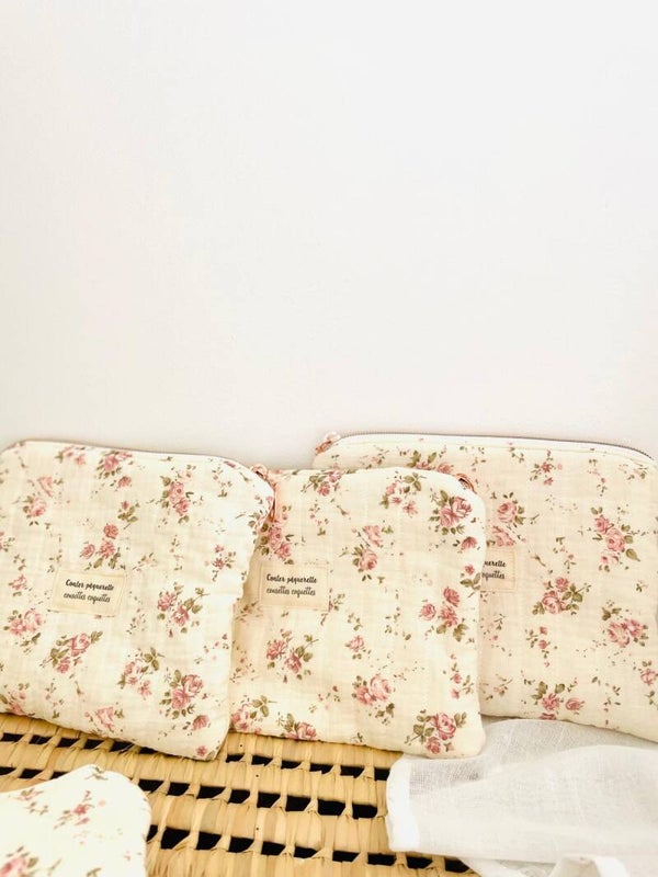 Trousse plate fleurie pour ranger des petits élastiques, des cotons ou autres essentiels.