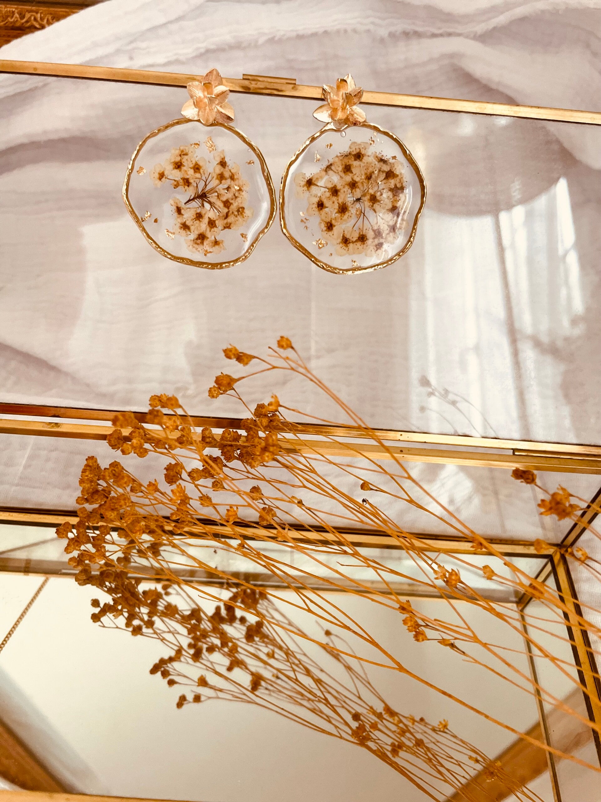 Très jolies boucles d'oreilles parfaite pour mariage avec inclusion de feuilles d'or.